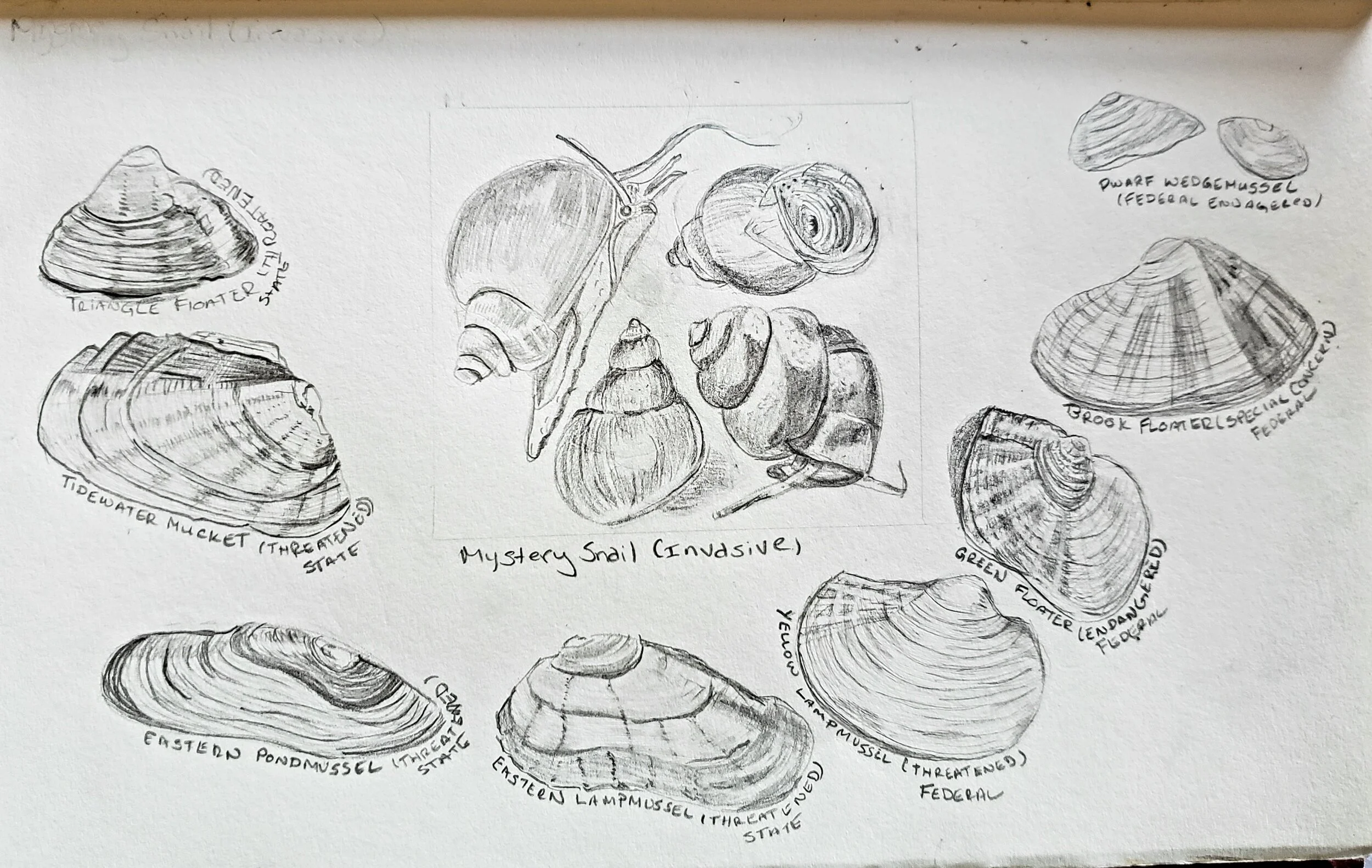 Sketch of New Jersey Freshwater Mussels and Mystery Snails